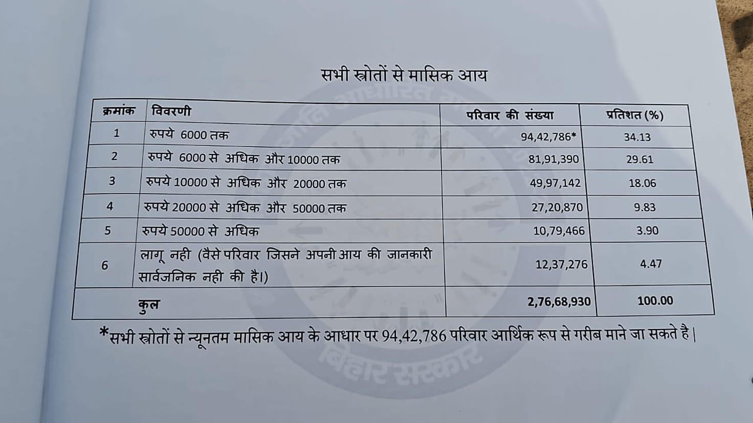 महागठबंधन सरकार द्वारा कराए गए जातीय सर्वे में चौकाने वाले आंकड़ा सामने आए हैं। बिहार विधान विधानमंडल में पेश किए जाने वाले जातीय-आर्थिक सर्वे रिपोर्ट के अनुसार बिहार के 34 प्रतिशत परिवारों की मासिक आमदनी मात्र छह हजार रुपये महीना है।