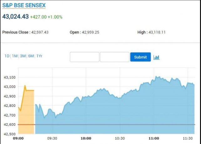 पटना। बिहार विधानसभा और उत्तर प्रदेश, मध्य प्रदेश, गुजरात जैसे राज्यों के उपचुनाव की मतगणना जारी है। इस बीच, भारतीय शेयर बाजार की रिकॉर्ड बढ़त के साथ शुरुआत हुई है। बीएसई सेंसेक्स ने अपने इतिहास में पहली बार 43 हजार का आंकड़ा पार किया है। सुबह 10.48 के आसपास सेंसेक्स 43 हजार के आंकड़े का पार कर गया। सुबह 11 बजे के आसपास सेंसेक्स 43,118.11 की ऐतिहासिक ऊंचाई तक पहुंच गया।