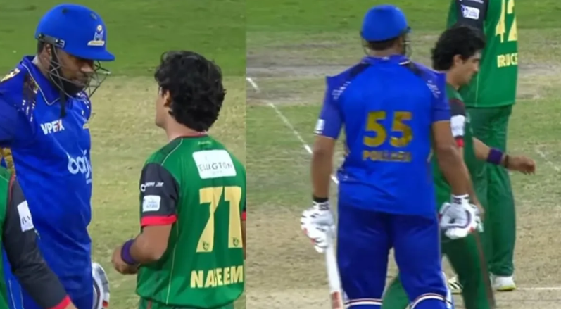 दरअसल, ये घटना MI एमिरेट्स की पारी के 11वें ओवर का है। नसीम शाह (Naseem Shah) ने जब ओवर की आखिरी गेंद फेंकी, तो नॉन-स्ट्राइकर एंड पर खड़े पोलार्ड ने नसीम से कुछ कहा। नसीम ने भी तुरंत पलटकर जवाब दिया, जिसके बाद मामला बढ़ गया। दोनों खिलाड़ियों के बीच जुबानी जंग इतनी तेज थी कि मामले को शांत करने के लिए ऑन-फील्ड अंपायरों को बीच-बचाव के लिए आना पड़ा।