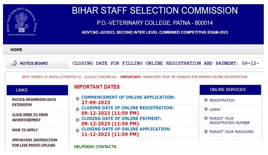 रजिस्ट्रेशन करने के साथ ही आवेदन शुल्क जमा करने की अंतिम तिथि भी 9 दिसंबर 2023 तय की गयी है। इसलिए अभ्यर्थी बिना अंतिम समय का इंतजार करते हुए तुरंत ही आधिकारिक वेबसाइट bssc.bihar.gov.in पर जाकर पंजीकरण कर सकते हैं।