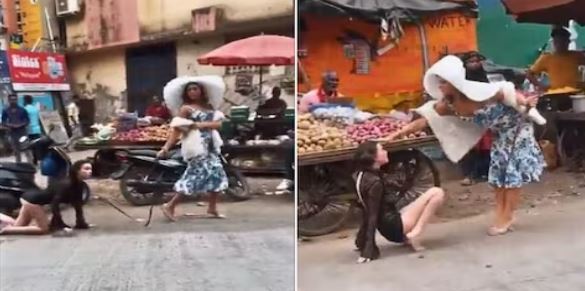 ट्विटर अकाउंट @terakyalenadena पर हाल ही में एक वीडियो पोस्ट किया गया है जो लोगों को काफी चौंका रहा है. इस वीडियो में एक महिला, अपने साथ एक लड़की को रोड पर घुमाने निकली है. हैरानी इस बात की है कि वो जो लड़की है, उसने काले रंग की अजीबोगरीब पोशाक पहनी है, चेहरे पर मेकअप किया है. उसके गले में कुत्तों वाला पट्टा है और वो अपने चार पैरों, यानी घुटनों और हाथों के बल रोड पर चल रही है. ठीक वैसे ही, जैसे पालतू जानवर चलते हैं.