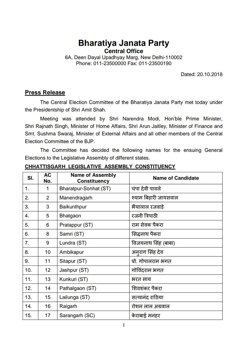इस बैठक के बाद पार्टी ने एक प्रेस रिलीज़ जारी कर के हालांकि, इस बैठक में केवल तेलंगाना, छत्तीसगढ़ और मिजोरम के विधानसभा चुनावों को लेकर ही चर्चा की गई छत्तीसगढ़ की 90 विधानसभा सीटों में से 77 पर प्रत्याशियों के नाम घोषित कर दिए है. इन नामों की घोसना पार्टी ने हाल ही में एक प्रेस रिलीज़ जारी कर की है.