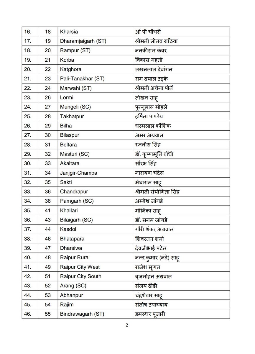 छत्तीसगढ़ विधानसभा चुनाव 2018 के लिए भाजपा द्वारा जारी की गई इस पहली सूची में 25 सीटें युवाओं को, 14 सीटें महिलाओं को, 19 सीटें अनुसूचित जनजाति और ,10 सीटें अनुसूचित जाति को दी गई है. इसके साथ ही 53 सीटें किसान पृष्ठभूमि वालों को, , 3 सीटों पर मेडिकल पृष्ठभूमि वालों को और एक सीट पर पूर्व आईपीएस को दी गई गई है.