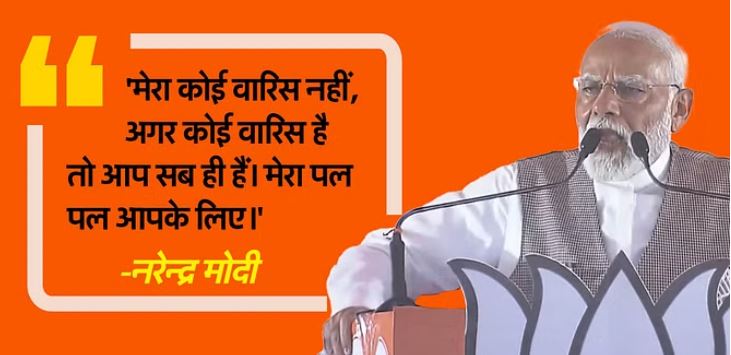 जनसभा में पीएम मोदी ने कहा कि बचपन में जब घर छोड़ा तब नहीं जानता था कि एक सौ चालीस करोड़ लोग मेरा परिवार बन जाएंगे, मैं आप लोगों के लिए मर खप रहा हूं। मेरा कोई वारिस नहीं है। अगर कोई वारिस है तो आप सब ही हैं। मेरा पल पल आपके लिए है। पीएम ने कहा कि हर बूथ पर कमल खिलेगा। यह चुनाव मजबूत भारत बनाने के लिए है।