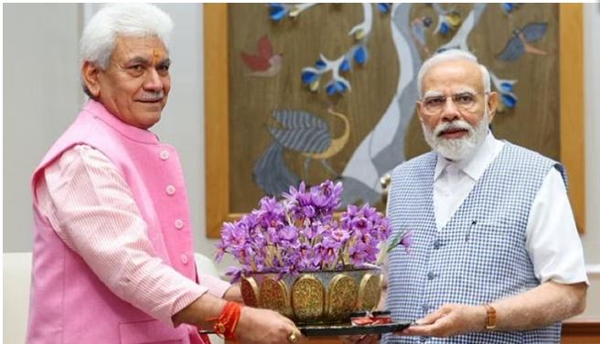 जम्मू कश्मीर के उपराज्यपाल मनोज सिन्हा ने मंगलवार को दिल्ली में प्रधानमंत्री नरेंद्र मोदी से मुलाकात की। इस दौरान उन्होंने प्रधानमंत्री के साथ केंद्र शासित प्रदेश के हालातों पर चर्चा की। साथ ही पीएम मोदी को एलजी ने केसर के फूलों का गुच्छ भेंट किया। केसर को कश्मीरी भाषा में कोंग पोश कहा जाता है।