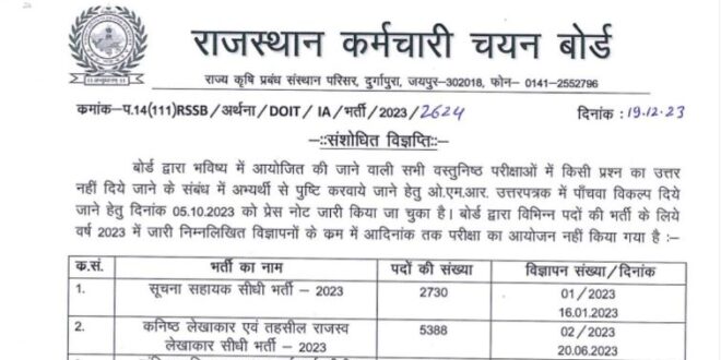 राजस्थान कर्मचारी चयन बोर्ड (RSMSSB) ने आगामी भर्ती परीक्षाओं के संबंध में अहम नोटिस जारी किया है। इसके मुताबिक, संविदा नर्स भर्ती, सूचना सहायक भर्ती, कनिष्ठ लेखाकार एवं तहसील राजस्व लेखाकार सीधी भर्ती, संविदा महिला स्वास्थ्य कार्यकर्ता सीधी भर्ती, पशु परिचर भर्ती सहित अन्य पदों के लिए आयोजित होने वाली परीक्षा के लिए ओएमआर शीट में पांचवां विकल्प लागू किया जाएगा।