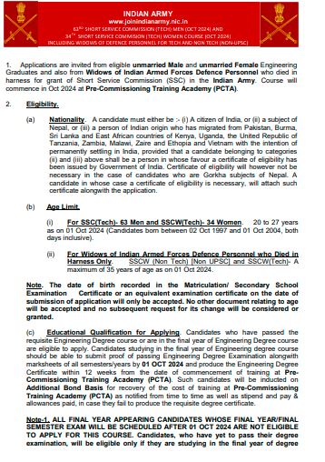भारतीय सेना की तरफ से इंडियन आर्मी शॉर्ट सर्विस कमीशन (SSC) के अनुदान के लिए इच्छुक और योग्य अविवाहित पुरुष और अविवाहित महिला इंजीनियरिंग स्नातकों और भारतीय सशस्त्र बल रक्षा कर्मियों की विडोज से ऑनलाइन आवेदन मांगे गए हैं। इच्छुक उम्मीदवार आधिकारिक वेबसाइट join Indianarmy.nic.in पर जाकर ऑनलाइन आवेदन कर सकते हैं। आवेदन पत्र जमा करने की आखिरी तारीख 21 फरवरी 2024 (दोपहर 3.00 बजे तक) तक है।
