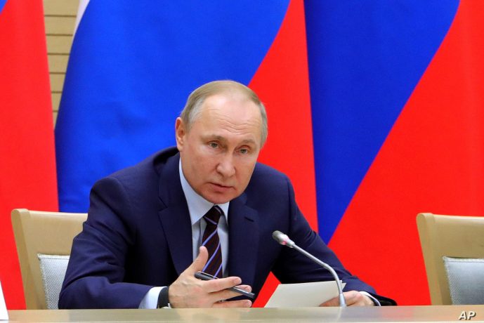 Russian President Vladimir Putin speaks as he chairs a meeting on drafting constitutional changes at the Novo-Ogaryovo residence outside Moscow, Russia, Thursday, Jan. 16, 2020. Putin proposed a set of constitutional amendments that could keep him in power well past the end of his term in 2024.(Mikhail Klimentyev, Sputnik, Kremlin Pool Photo via AP)