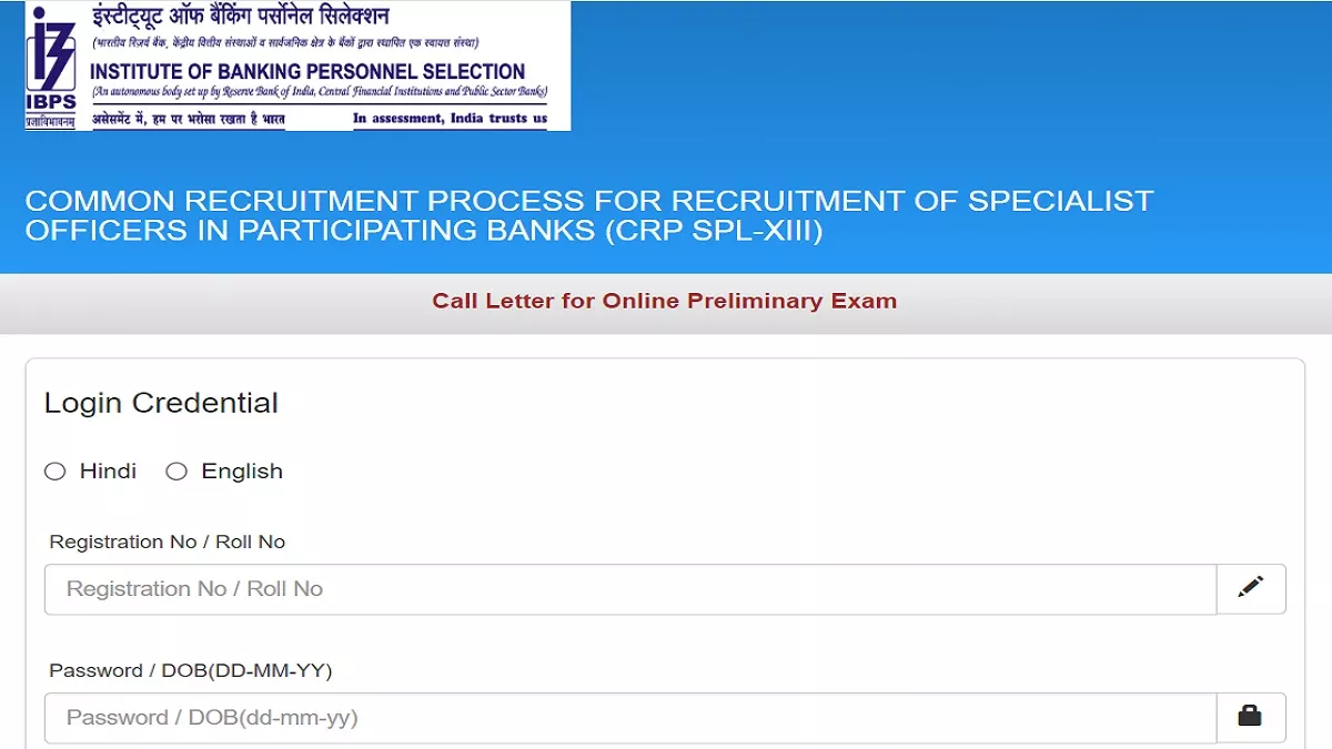 ऐसे में जिन उम्मीदवारों ने आइबीपीएस स्पेशलिस्ट ऑफिसर परीक्षा 2023 के लिए आवेदन किया है, वे पहले चरण प्रारंभिक परीक्षा में सम्मिलित होने के लिए अपना एडमिट कार्ड संस्थान की आधिकारिक वेबसाइट, ibps.in पर एक्टिव लिंक या नीचे दिए गए डायरेक्ट लिंक से डाउनलोड कर सकते हैं। इसके लिए उम्मीदवारों को अपने रजिस्ट्रेशन नंबर और पासवर्ड के माध्यम से लॉग-इन करना होगा।