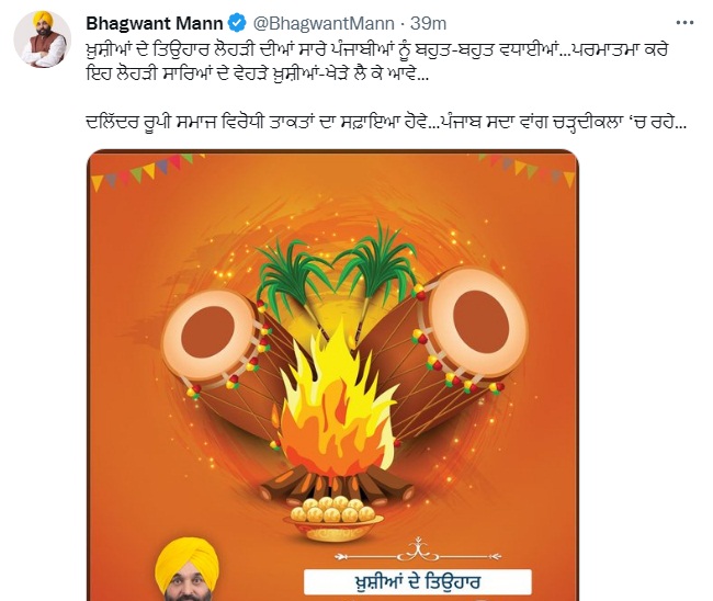 सोशल मीडिया पर बधाई देते सी.एम. मान ने लिखा,”खुशियों के त्योहार लोहड़ी की सभी पंजाबियों को बहुत-बहुत बधाई…परमात्मा करें ये लोहड़ी सभी के घर खुशियों की सौगात लेकर आएं। समाज में फैली दरिद्रता रूपी बुराइयों का सफाया हो… लोहड़ी मुबारक।”