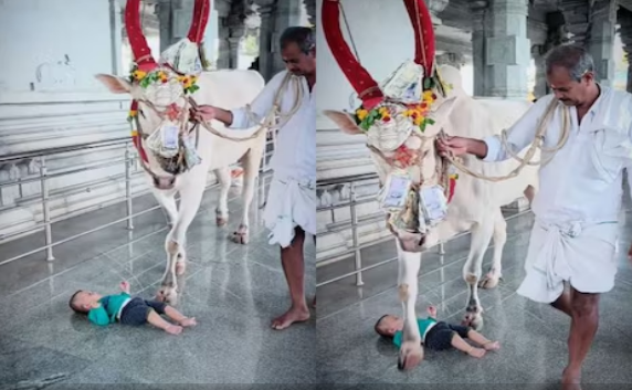 इंस्टाग्राम यूजर @sunilram_05 ने हाल ही में एक वीडियो पोस्ट किया है, जिसमें एक बच्चे के ऊपर से गाय को गुजारा जा रहा है. ये वीडियो कर्नाटक के श्री कालभैरवेश्वर स्वामी मंदिर का है. वायरल वीडियो (Cow walk over baby tradition) में आप देख सकते हैं कि मंदिर परिसर के अंदर एक गाय नजर आ रही है जो काफी विशाल है. उसकी सींघ भी बहुत लंबी है. उस गाय को एक आदमी ने पकड़ा है. गाय की सींघ पर नोट बंधे हुए हैं, जो शायद मन्नत के तौर पर बांघे गए होंगे.