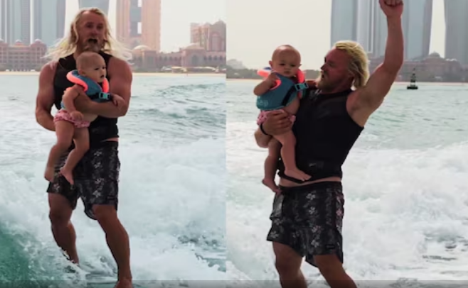 दुधमुंहे बच्चे को पापा ने कराई सर्फिंग, लहरों के बीच दिखी डॉल्फिन!