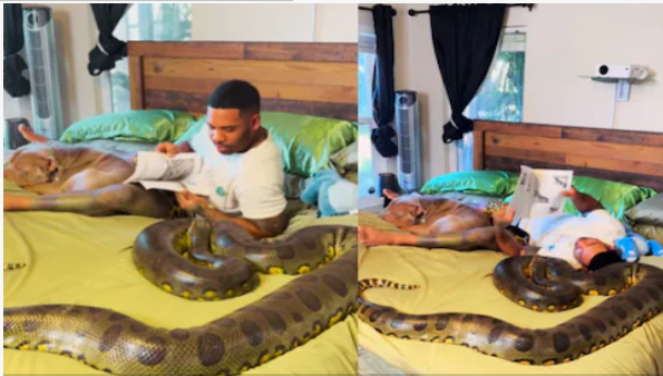 बिस्तर पर विशालकाय सांप के साथ लेटा शख्स