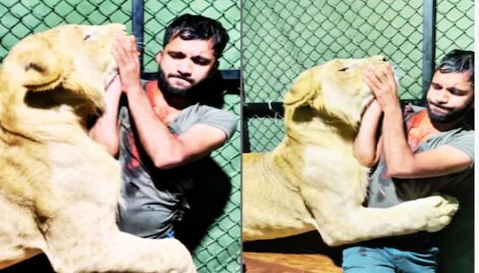 शख्स के गले पड़ी शेरनी, पलभर पहले बन रहे थे जांबाज़, झट से उड़ा चेहरे का रंग
