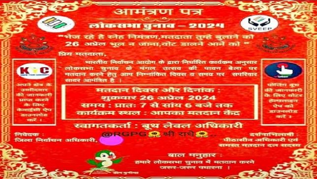 18वीं लोकसभा चुनाव के दूसरे चरण का मतदान 26 अप्रैल को है। जिस प्रकार शादी के लिए कार्ड छपवाया जाता है, उसी प्रकार मतदान के लिए भी एक कार्ड छपवाया गया है। यह कार्ड चर्चा में बना हुआ है। इस कार्ड में निवेदक, स्वागतकर्ता, दर्शनाभिलाषी और बाल मनुहार भी लिखी हुई है।