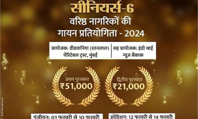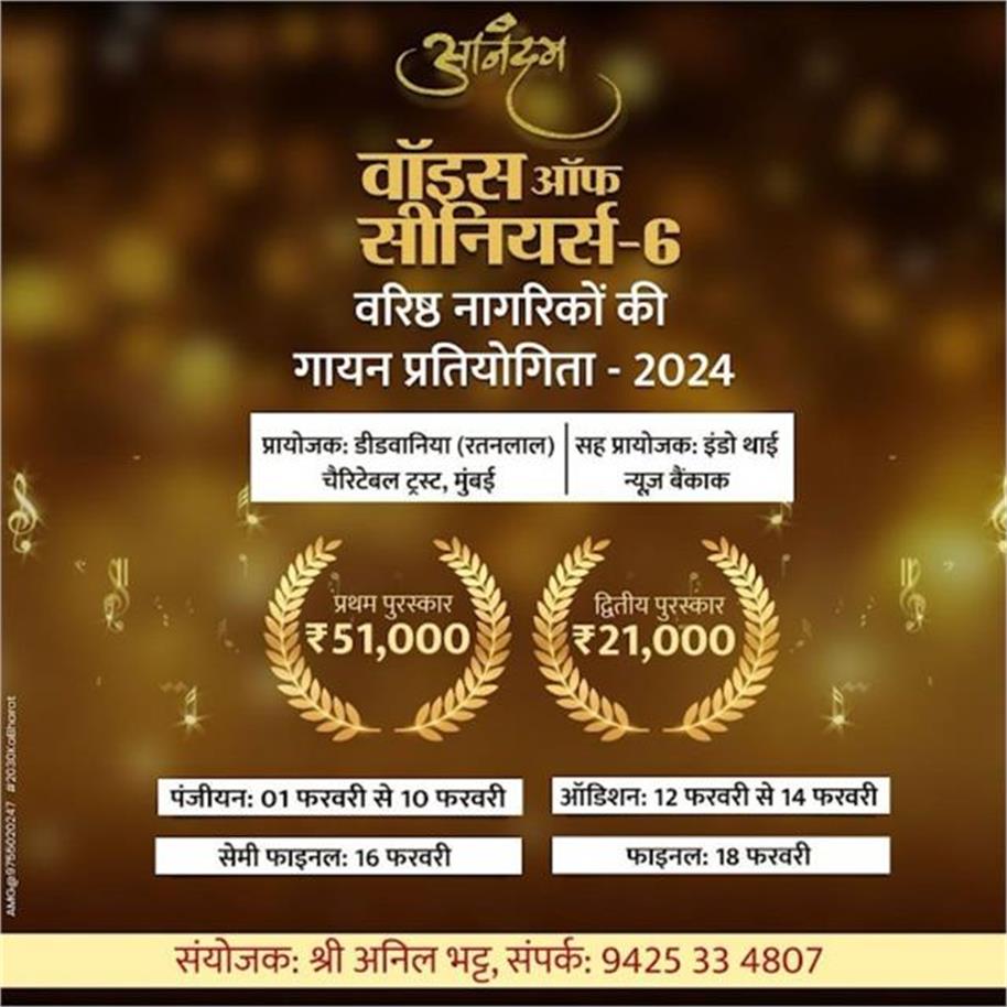 मध्य प्रदेश के इंदौर स्थित आनन्दम सीनियर सिटीज़न सेंटर (आनन्दम) वरिष्ठ नागरिकों की गायन प्रतियोगिता के छठे संस्करण, वॉइस ऑफ सीनियर्स-6 का आयोजन करने जा रहा है। प्रतियोगिता का हिस्सा बनने के लिए रजिस्ट्रेशन प्रक्रिया की शुरुआत 1 फरवरी 2024 से हो रही है, जबकि इसकी अंतिम तारीख 10 फरवरी तय की गई है। पूरी तरह निःशुल्क इस ऑनलाइन रजिस्ट्रेशन के लिए इच्छुक व योग्य प्रतिभागी https://forms.gle/UL6JpipXU1Tnp1Eu8 लिंक के माध्यम से अपना रजिस्ट्रेशन करा सकते हैं। प्रतियोगिता में अपने हुनर से सुरों का समां बाँधने वाले प्रथम विजेता को 51000 रुपए तथा द्वितीय विजेता को 21000 रुपए के नकद पुरस्कार से सम्मानित किया जाएगा।