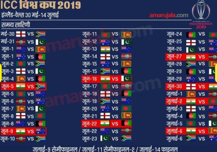 आईसीसी विश्व कप का उद्घाटन मैच 30 मई को ओवल के मैदान में मेजबान इंग्लैंड और दक्षिण अफ्रीका के बीच खेला जाएगा। मौजूदा विश्व चैंपियन ऑस्ट्रेलिया अपना पहला मैच अफगानिस्तान के खिलाफ एक जून को ब्रिस्टल में खेलेगी। दो बार की विश्व चैंपियन भारत अपना पहला मैच 5 जून 2019 को दक्षिण अफ्रीका के खिलाफ साउथम्पटन में खेलेगी।